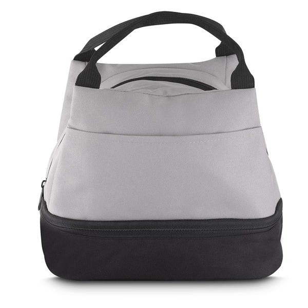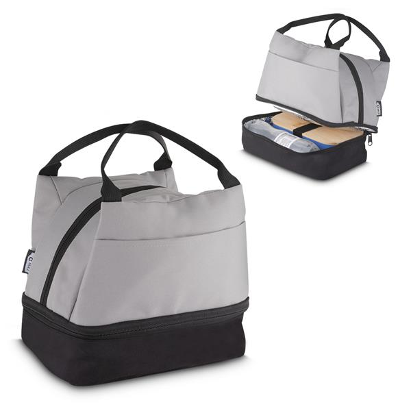 Bolsa térmica em tecido PET Reciclado com 2 compartimentos térmicos costurados, bolso frontal e alça de mão. Gravação da logomarca em 1 cor já inclusa.