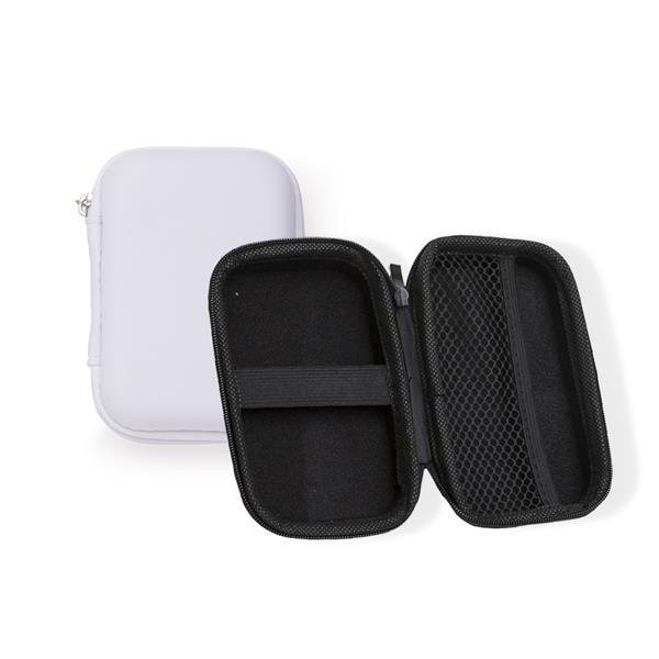 Estojo em couro sintético com zíper, possui rede interna e elástico de nylon. Case utilizada para montar kits tecnológicos. Gravação da logomarca em 1 cor já inclusa.
