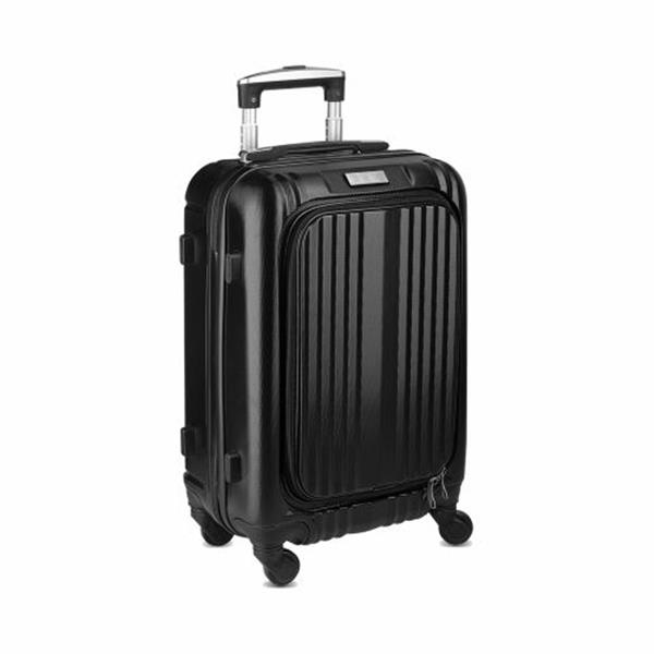 Mala viagem pequena em ABS (estireno de acrilonitrilo e butadieno) e interior em nylon 210D. Abertura frontal com zíper para acesso ao interior da mala com três bolsos interno e porta notebook. Forro poliéster, sistema de carrinho de aço, cadeado com senha/segredo, bolso Frontal, Alça de mão na lateral e na parte superior e quatro rodas de 360 graus. Compartimento interno para notebooks de até 13". Gravação da logomarca a laser já incluso.