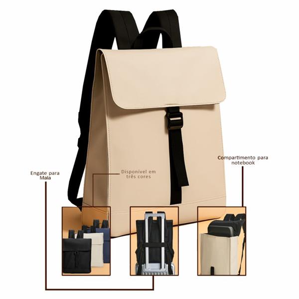 Mochila em couro sintético impermeável com capacidade de até 13 litros. Apresenta compartimento interno com bolso para notebooks de até 13 polegadas. Possui duas alças para as costas, alça de mão e engate posterior para mala de viagem. Gravação da logomarca em 1 cor já inclusa.
