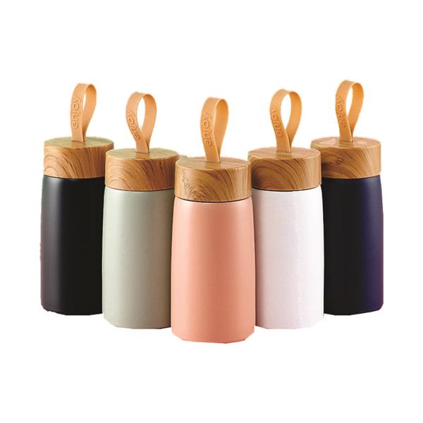 Garrafa isotérmica inox 304 com parede dupla, capacidade de 250ml. Contém tampa plástica com design de bambu e alça de silicone para transporte. Gravação da logomarca a laser já incluso.